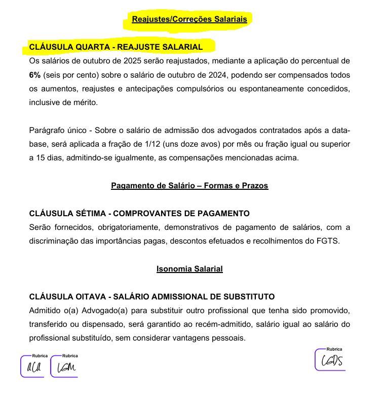 “Prezados colegas da advocacia, informo que a CCT 2025/2026 foi renovada com o Sindicato das Sociedades de Advogados do Estado de São Paulo e Rio de Janeiro (SINSA), e já está devidamente assinada pelas partes.