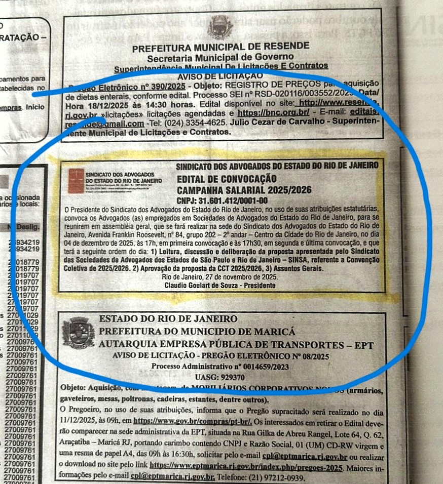 SAERJ CONVOCA ADVOCACIA PARA ASSEMBLEIA NESTA QUINTA (04/12), ÀS 17H, PARA DELIBERAR SOBRE A CONVENÇÃO COLETIVA DE TRABALHO 2025/2026