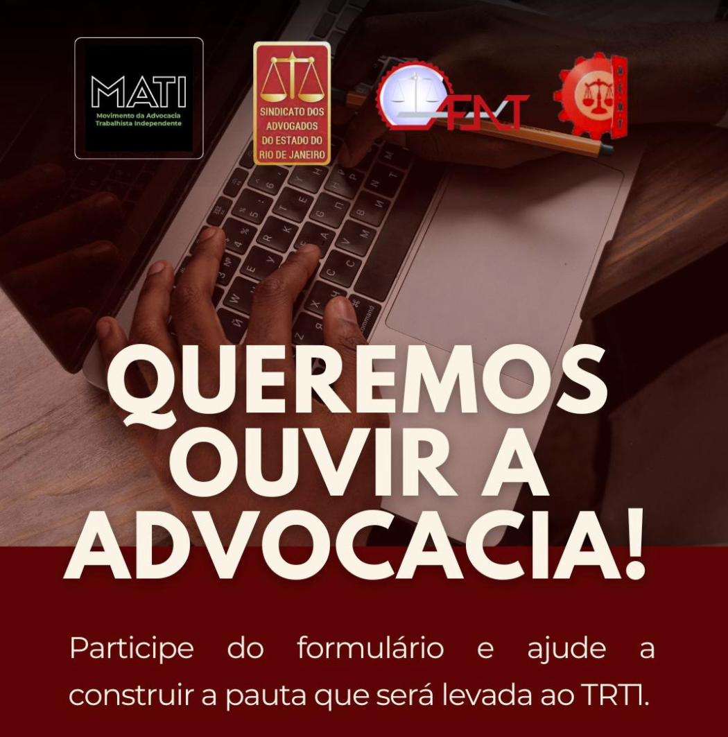 A advocacia do Rio de Janeiro tem voz e queremos ouvir você! O Sindicato dos Advogados do Estado do Rio de Janeiro (SAERJ) participa da consulta junto com o MATI, AFAT e ACAT, para fazer uma pauta conjunta de reivindicações da advocacia e levar à Presidência do Tribunal Regional do Trabalho da 1ª Região (TRT1 – RJ).